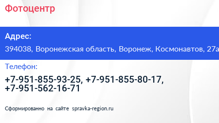 Фотоцентр по адресу 394038, Воронежская область, Воронеж, Космонавтов, 27а в дальнейшем Организация, размещена в следующих категориях: