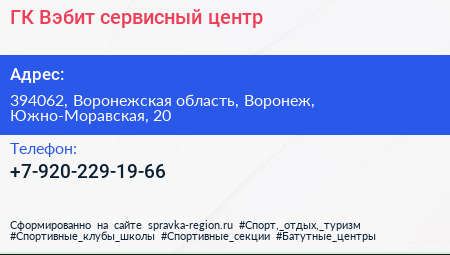 ГК Вэбит, сервисный центр по адресу 394062, Воронежская область, Воронеж, Южно-Моравская, 20 в дальнейшем Организация, размещена в следующих категориях: