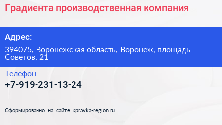 Градиента, производственная компания по адресу 394075, Воронежская область, Воронеж, площадь Советов, 21 в дальнейшем Организация, размещена в следующих категориях:
