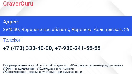 GraverGuru по адресу 394030, Воронежская область, Воронеж, Кольцовская, 25 в дальнейшем Организация, размещена в следующих категориях: