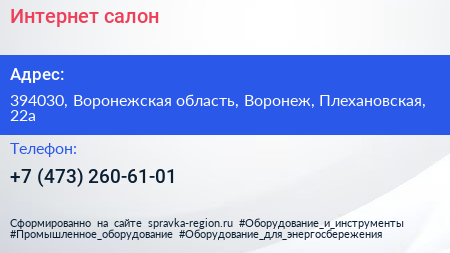 Для связи с организацией воспользуйтесь номером телефона: +7 (473) 260-61-01. Пн: c 09:00-18:00, Вт: c 09:00-18:00, Ср: c 09:00-18:00, Чт: c 09:00-18:00, Пт: c 09:00-18:00, Сб: выходной, Вс: выходной, вы можете обратиться в эту организацию.