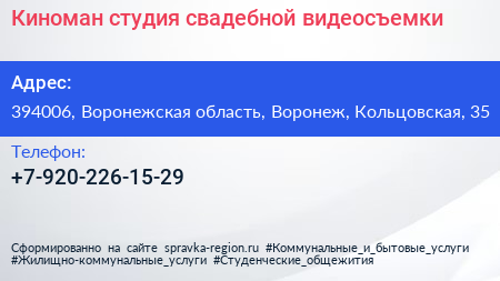 Киноман, студия свадебной видеосъемки по адресу 394006, Воронежская область, Воронеж, Кольцовская, 35 в дальнейшем Организация, размещена в следующих категориях: