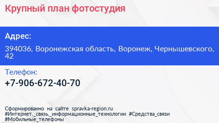 Крупный план, фотостудия по адресу 394036, Воронежская область, Воронеж, Чернышевского, 42 в дальнейшем Организация, размещена в следующих категориях: