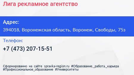 Лига, рекламное агентство по адресу 394018, Воронежская область, Воронеж, Свободы, 75з в дальнейшем Организация, размещена в следующих категориях: