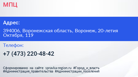 МПЦ по адресу 394006, Воронежская область, Воронеж, 20-летия Октября, 119 в дальнейшем Организация, размещена в следующих категориях: