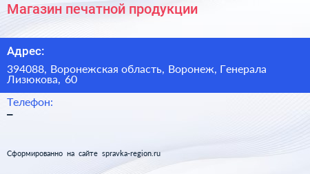 Магазин печатной продукции по адресу 394088, Воронежская область, Воронеж, Генерала Лизюкова, 60 в дальнейшем Организация, размещена в следующих категориях:
