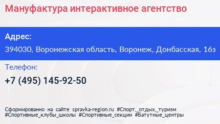 Мануфактура, интерактивное агентство по адресу 394030, Воронежская область, Воронеж, Донбасская, 16з в дальнейшем Организация, размещена в следующих категориях: