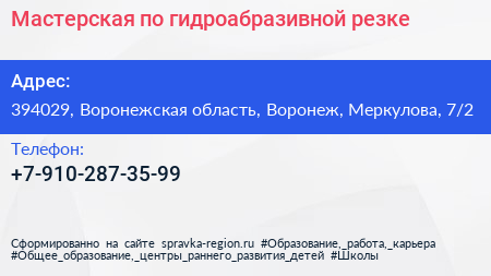 Мастерская по гидроабразивной резке по адресу 394029, Воронежская область, Воронеж, Меркулова, 7/2 в дальнейшем Организация, размещена в следующих категориях: