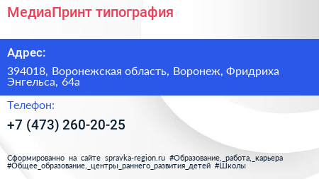 МедиаПринт, типография по адресу 394018, Воронежская область, Воронеж, Фридриха Энгельса, 64а в дальнейшем Организация, размещена в следующих категориях: