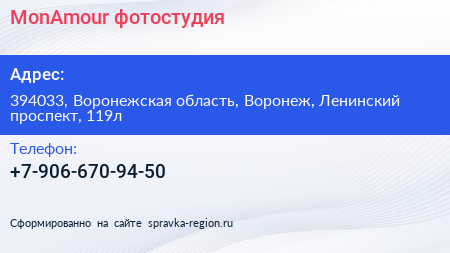 MonAmour, фотостудия по адресу 394033, Воронежская область, Воронеж, Ленинский проспект, 119л в дальнейшем Организация, размещена в следующих категориях: