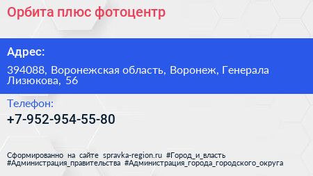 Орбита плюс, фотоцентр по адресу 394088, Воронежская область, Воронеж, Генерала Лизюкова, 56 в дальнейшем Организация, размещена в следующих категориях:
