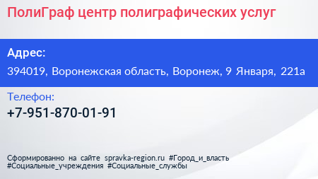 ПолиГраф, центр полиграфических услуг по адресу 394019, Воронежская область, Воронеж, 9 Января, 221а в дальнейшем Организация, размещена в следующих категориях: