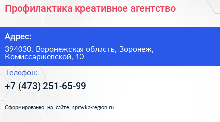 Профилактика, креативное агентство по адресу 394030, Воронежская область, Воронеж, Комиссаржевской, 10 в дальнейшем Организация, размещена в следующих категориях: