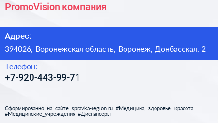 PromoVision, компания по адресу 394026, Воронежская область, Воронеж, Донбасская, 2 в дальнейшем Организация, размещена в следующих категориях: