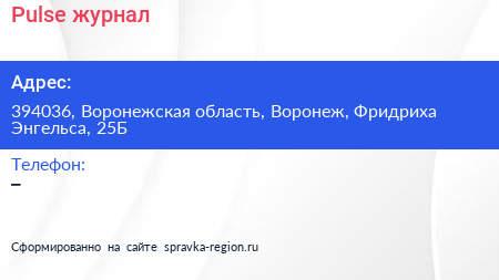 Pulse, журнал по адресу 394036, Воронежская область, Воронеж, Фридриха Энгельса, 25Б в дальнейшем Организация, размещена в следующих категориях: