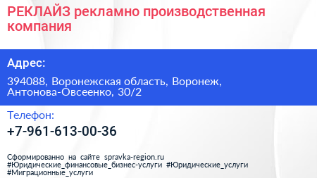 РЕКЛАЙЗ, рекламно-производственная компания по адресу 394088, Воронежская область, Воронеж, Антонова-Овсеенко, 30/2 в дальнейшем Организация, размещена в следующих категориях: