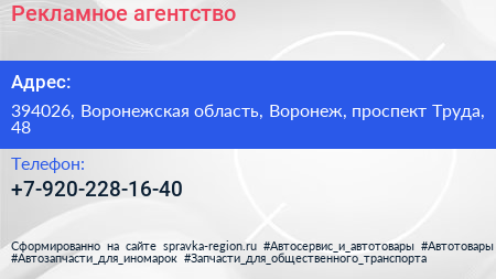 Рекламное агентство по адресу 394026, Воронежская область, Воронеж, проспект Труда, 48 в дальнейшем Организация, размещена в следующих категориях: