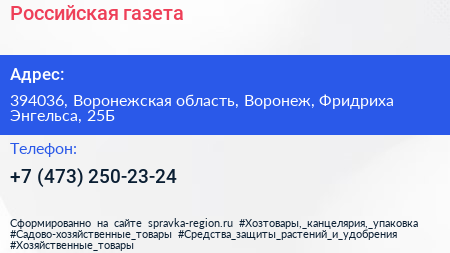 Российская, газета по адресу 394036, Воронежская область, Воронеж, Фридриха Энгельса, 25Б в дальнейшем Организация, размещена в следующих категориях: