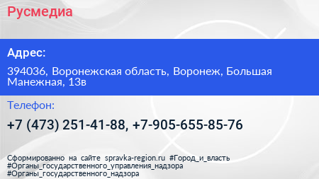 Русмедиа по адресу 394036, Воронежская область, Воронеж, Большая Манежная, 13в в дальнейшем Организация, размещена в следующих категориях: