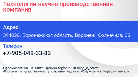 Технологии, научно-производственная компания по адресу 394026, Воронежская область, Воронеж, Солнечная, 33 в дальнейшем Организация, размещена в следующих категориях: