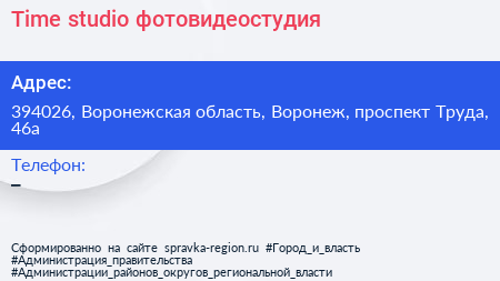 Time studio, фотовидеостудия по адресу 394026, Воронежская область, Воронеж, проспект Труда, 46а в дальнейшем Организация, размещена в следующих категориях: