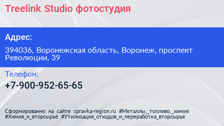 Treelink Studio, фотостудия по адресу 394036, Воронежская область, Воронеж, проспект Революции, 39 в дальнейшем Организация, размещена в следующих категориях: