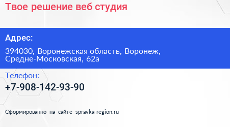 Твое решение, веб-студия по адресу 394030, Воронежская область, Воронеж, Средне-Московская, 62а в дальнейшем Организация, размещена в следующих категориях:
