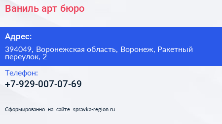 Ваниль, арт-бюро по адресу 394049, Воронежская область, Воронеж, Ракетный переулок, 2 в дальнейшем Организация, размещена в следующих категориях: