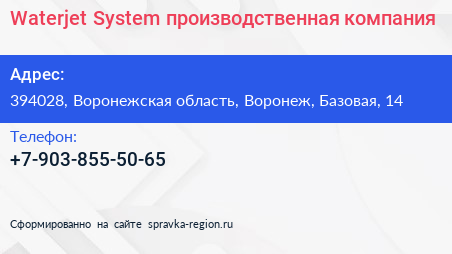 Waterjet System, производственная компания по адресу 394028, Воронежская область, Воронеж, Базовая, 14 в дальнейшем Организация, размещена в следующих категориях: