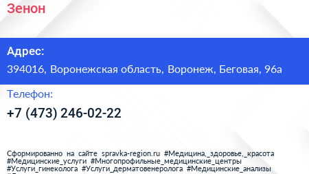 Зенон по адресу 394016, Воронежская область, Воронеж, Беговая, 96а в дальнейшем Организация, размещена в следующих категориях: