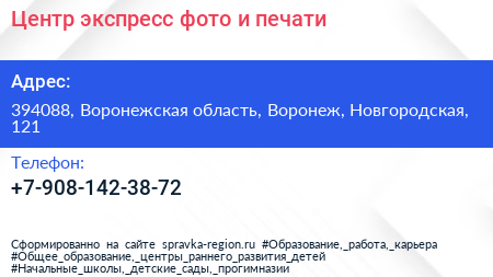 Центр экспресс-фото и печати по адресу 394088, Воронежская область, Воронеж, Новгородская, 121 в дальнейшем Организация, размещена в следующих категориях: