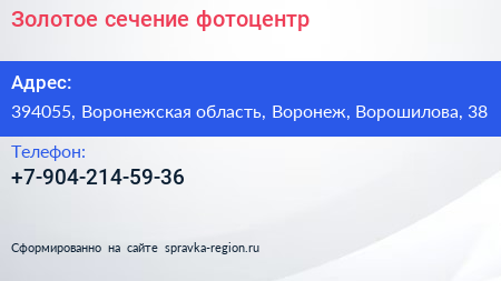 Золотое сечение, фотоцентр по адресу 394055, Воронежская область, Воронеж, Ворошилова, 38 в дальнейшем Организация, размещена в следующих категориях: