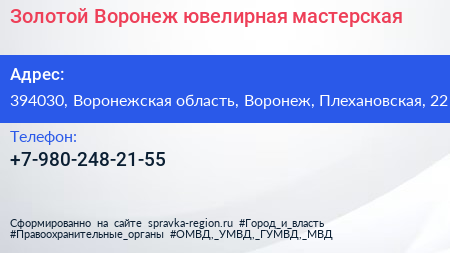Золотой Воронеж, ювелирная мастерская по адресу 394030, Воронежская область, Воронеж, Плехановская, 22 в дальнейшем Организация, размещена в следующих категориях: