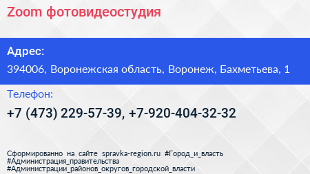 Zoom, фотовидеостудия по адресу 394006, Воронежская область, Воронеж, Бахметьева, 1 в дальнейшем Организация, размещена в следующих категориях: