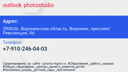 outlook photostudio по адресу 394036, Воронежская область, Воронеж, проспект Революции, 46 в дальнейшем Организация, размещена в следующих категориях: