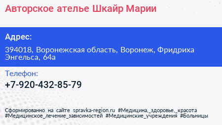 Авторское ателье Шкайр Марии по адресу 394018, Воронежская область, Воронеж, Фридриха Энгельса, 64а в дальнейшем Организация, размещена в следующих категориях: