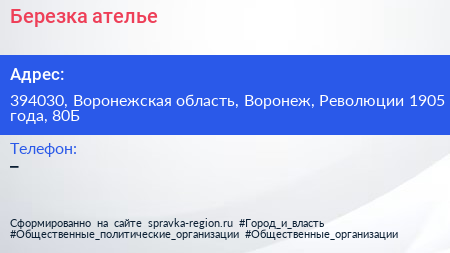 Березка, ателье по адресу 394030, Воронежская область, Воронеж, Революции 1905 года, 80Б в дальнейшем Организация, размещена в следующих категориях: