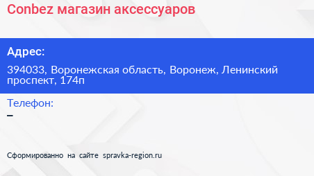 Conbez, магазин аксессуаров по адресу 394033, Воронежская область, Воронеж, Ленинский проспект, 174п в дальнейшем Организация, размещена в следующих категориях: