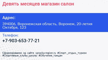 Девять месяцев, магазин-салон по адресу 394006, Воронежская область, Воронеж, 20-летия Октября, 123 в дальнейшем Организация, размещена в следующих категориях: