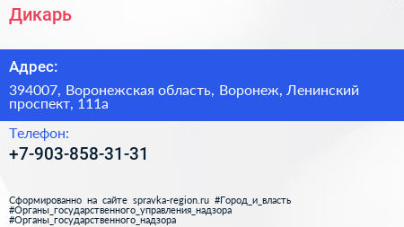 Дикарь по адресу 394007, Воронежская область, Воронеж, Ленинский проспект, 111а в дальнейшем Организация, размещена в следующих категориях: