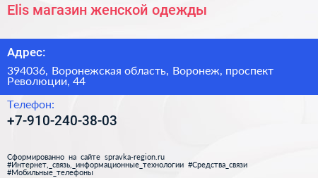 Elis, магазин женской одежды по адресу 394036, Воронежская область, Воронеж, проспект Революции, 44 в дальнейшем Организация, размещена в следующих категориях: