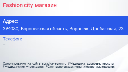 Fashion city, магазин по адресу 394030, Воронежская область, Воронеж, Донбасская, 23 в дальнейшем Организация, размещена в следующих категориях: