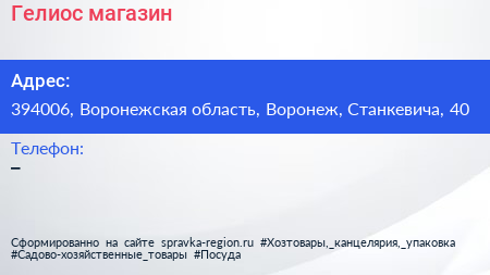 Гелиос, магазин по адресу 394006, Воронежская область, Воронеж, Станкевича, 40 в дальнейшем Организация, размещена в следующих категориях: