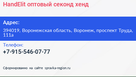 HandElit, оптовый секонд-хенд по адресу 394019, Воронежская область, Воронеж, проспект Труда, 111а в дальнейшем Организация, размещена в следующих категориях: