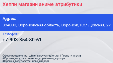 Хеппи, магазин аниме-атрибутики по адресу 394030, Воронежская область, Воронеж, Кольцовская, 27 в дальнейшем Организация, размещена в следующих категориях: