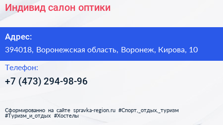 Индивид, салон оптики по адресу 394018, Воронежская область, Воронеж, Кирова, 10 в дальнейшем Организация, размещена в следующих категориях: