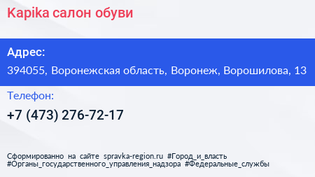Kapika, салон обуви по адресу 394055, Воронежская область, Воронеж, Ворошилова, 13 в дальнейшем Организация, размещена в следующих категориях: