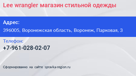 Lee wrangler, магазин стильной одежды по адресу 396005, Воронежская область, Воронеж, Парковая, 3 в дальнейшем Организация, размещена в следующих категориях: