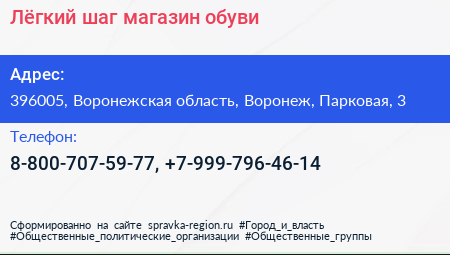 Лёгкий шаг, магазин обуви по адресу 396005, Воронежская область, Воронеж, Парковая, 3 в дальнейшем Организация, размещена в следующих категориях: