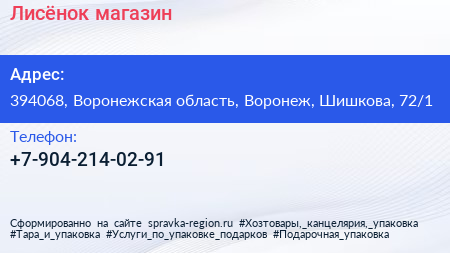 Лисёнок, магазин по адресу 394068, Воронежская область, Воронеж, Шишкова, 72/1 в дальнейшем Организация, размещена в следующих категориях: